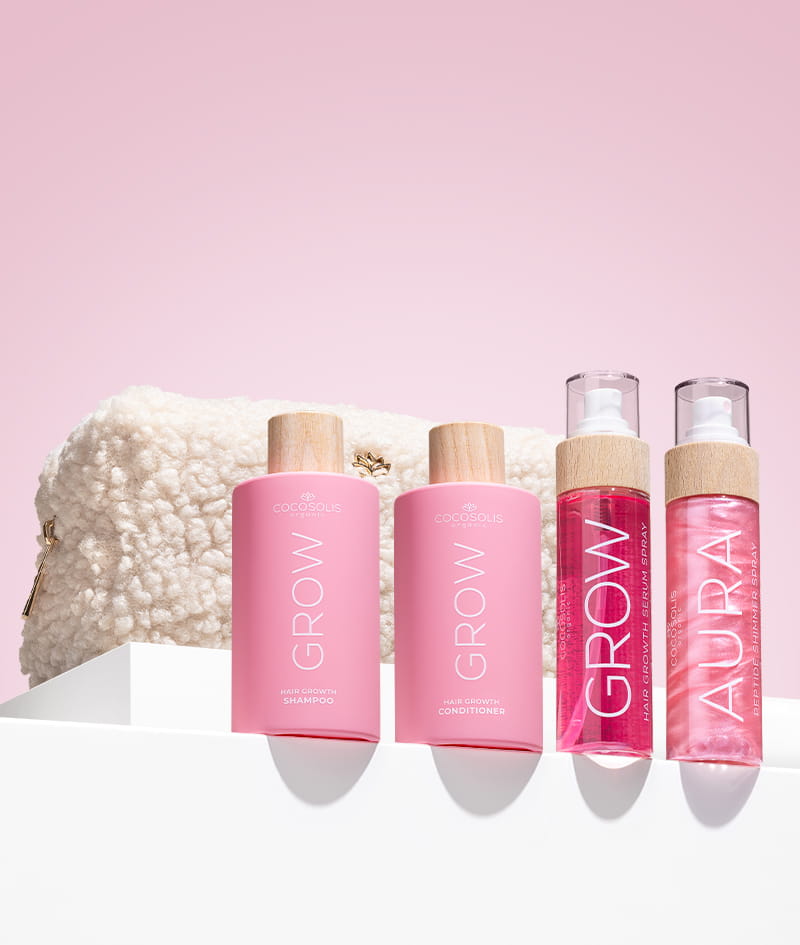 O Champô e o Condicionador GROW, com o ingrediente clinicamente comprovado KERASCALP™, juntamente com o Spray Sérum GROW com o Hair Stimulation Complex™ clinicamente comprovado, ajudam a alcançar um cabelo mais forte, mais espesso e em crescimento. AURA PINK hidrata e ilumina com um brilho rosa irresistível da cabeça aos pés. A Cloud Pouch é uma oferta nossa: um tesouro fofinho na sua coleção de bolsas.