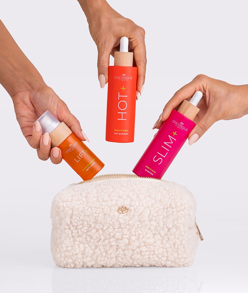 LIFT+ eleva o peito, tonifica e alisa a zona do pescoço e decote. SLIM+ reduz a circunferência, tonifica e molda a barriga e os braços. HOT+ queima gordura e reduz a circunferência dos glúteos e das coxas. A Cloud Pouch é uma oferta nossa: um tesouro fofinho na sua coleção de bolsas.
